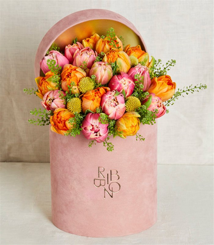 Pembe, turuncu renkleri ile iç açıcı, adeta bir lale bahçesini anımsatan pembe kadife kutudaki laleler ile sevdiklerinizi mutlu edin.