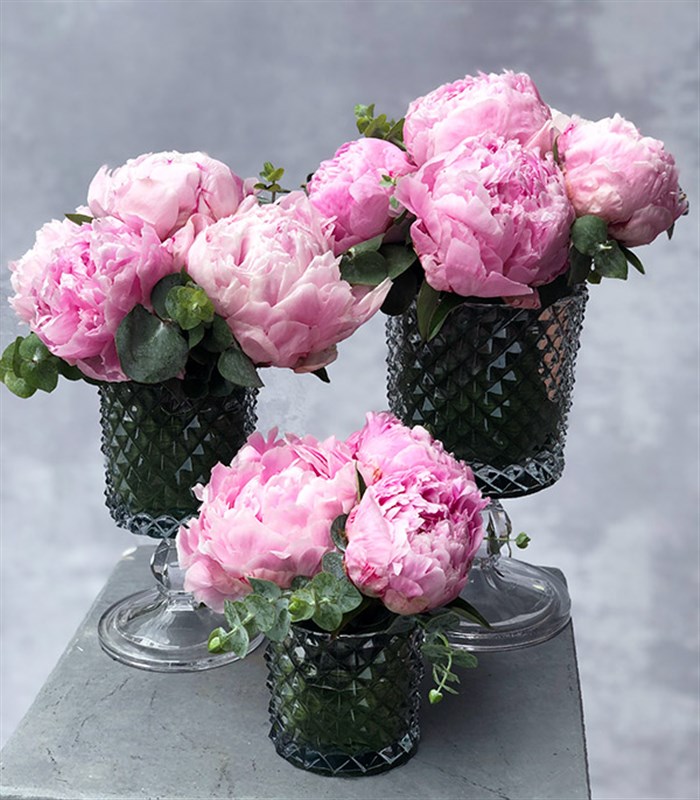 Luxe çok şık 3'Lü kesme vazo seti ve luxe ithal pembe şakayıklardan dizayn edildi.