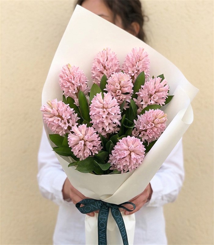 Taptaze pembe sümbüllerle mis kokulu bir buket.