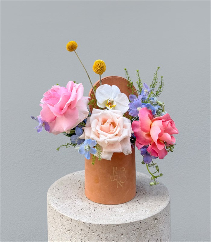 Pembe gül tonları ve mavi delfinyumların sevimli mini kutunun içinde özenle bir araya getirildiği tatlı ve şık bir tasarım. Küçük ama etkili yapısıyla sevdiklerinize sürpriz yapmak için mükemmel bir seçim.