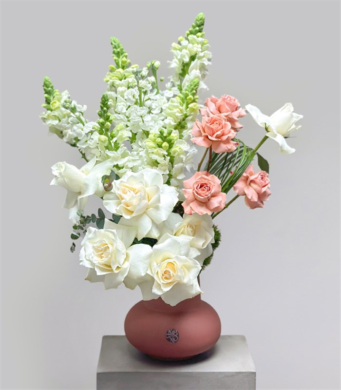 2025'in pantone rengi mocha mousse'dan ilhamla hazırladığımız el yapımı seramik vazoda beyaz ve cappucino güller, beyaz aslanağızı çiçekleri ve mevsim yeşillikleri ile tasarlanmıştır.
