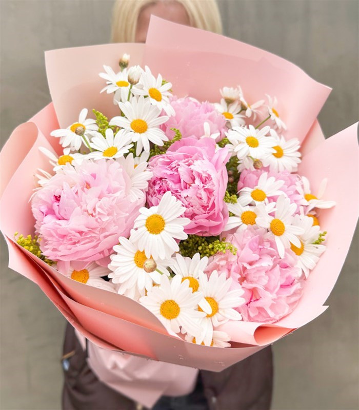 Şakayık ve papatyalardan romantik bir buket....