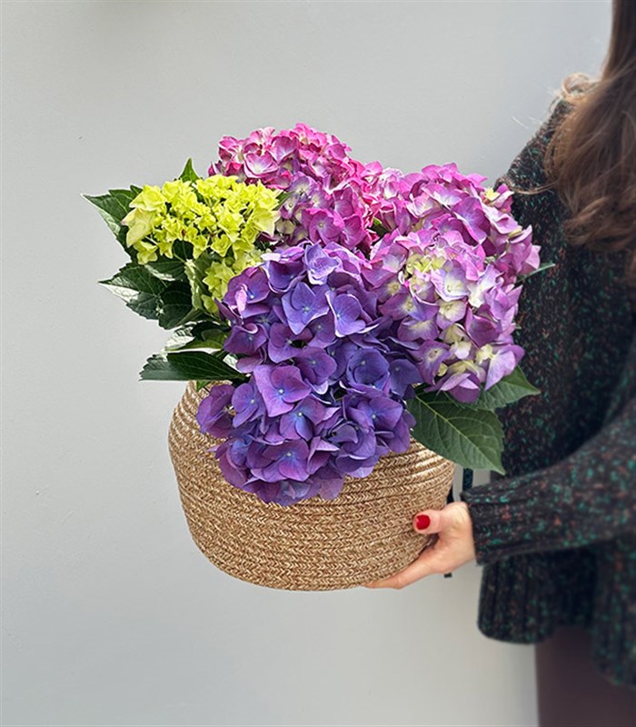 Purple hydrangea flower in pot planted in a natural jute basket.