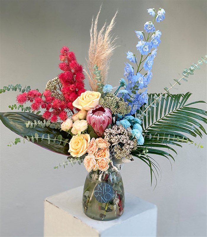 Queen Protealı Delfinyum Kayısı Gül Aranjman Limited Edition