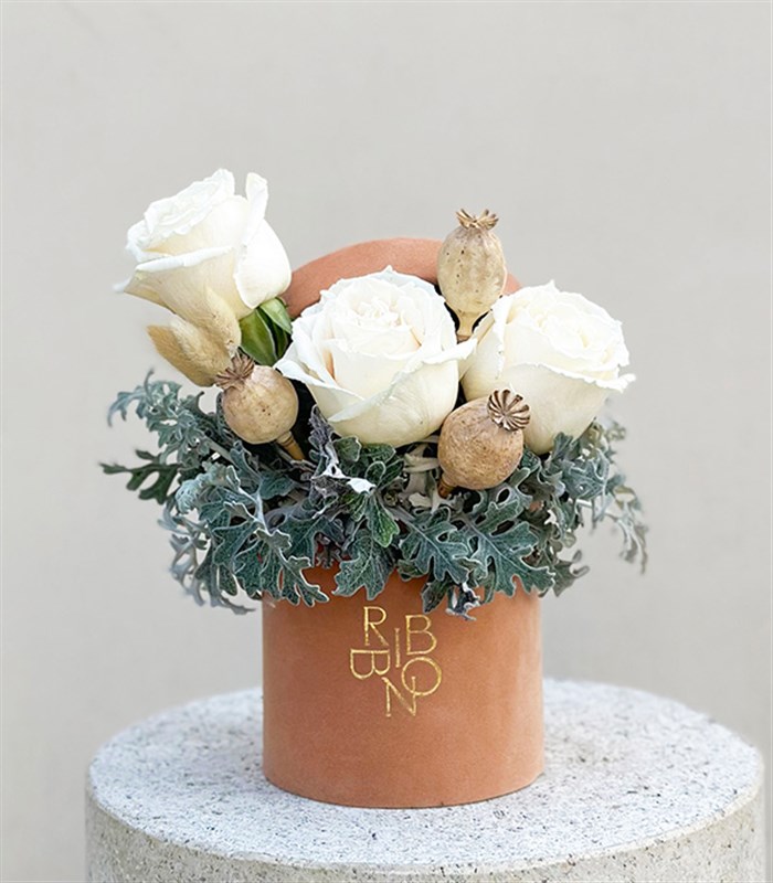 Toffie renkli RIBBON'a özel mini kadife kutu içerisine 3 adet beyaz ekvator gülü, 3 adet haşhaş ve pelin otu yeşillikleri ile dizayn edildi.