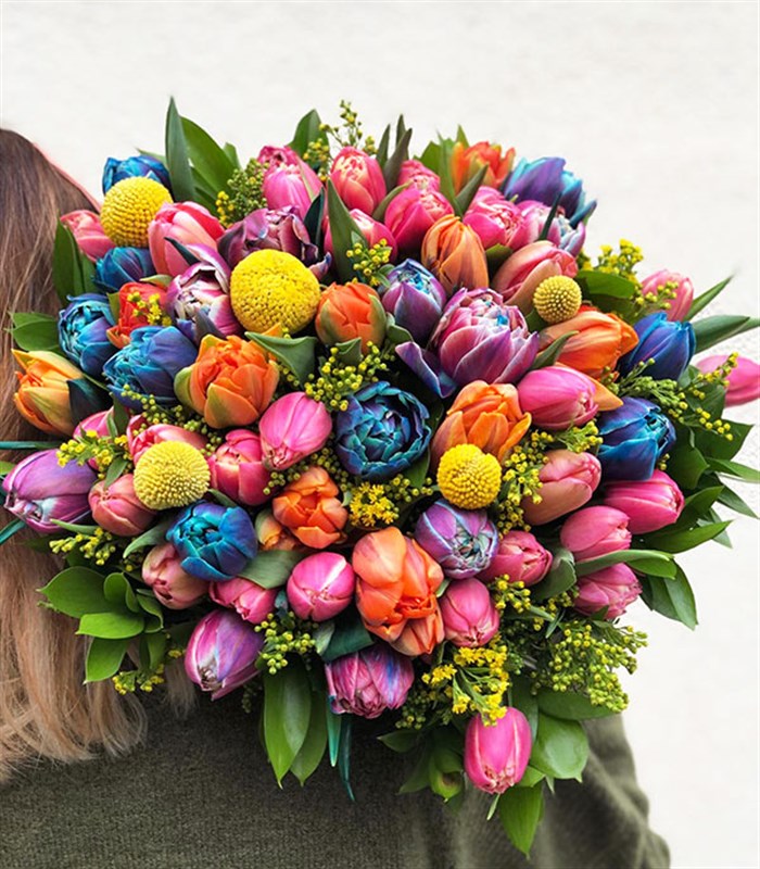 Kucak dolusu, taze, capcanlı renkte laleler; adeta bir lale bahçesine düşmüş hissi veren ferahlıkta.