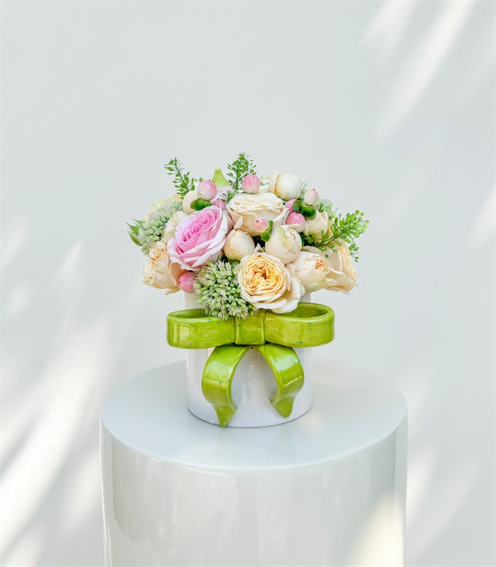 Tamamen el işi seramik olarak dizayn edilen beyaz renkli, yeşil kurdele kulplu mug içerisinde pembe ve somon çardak güller, pembe hiperikum, somon lisyantus ve mevsime özel yeşilliklerden oluşan mini aranjman bulunmaktadır.