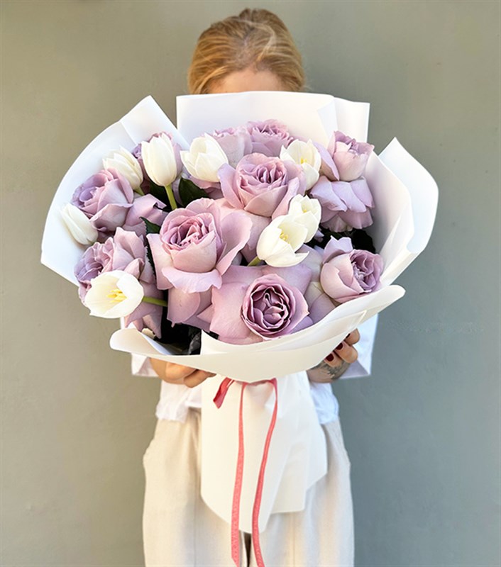 Bu benzersiz buket tasarımı en özel günleriniz için düşünülmüş çok şık bir hediye. Mis kokulu ithal ekvator gülleri ve zarif beyaz laleler gören herkesi kendine hayran bırakacak kadar güzel.