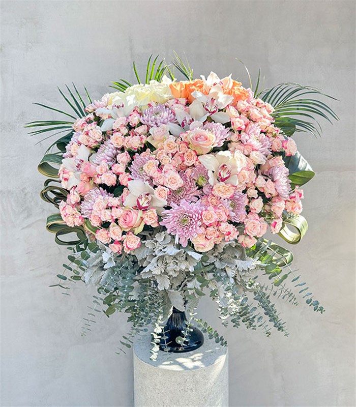 Siyah kesme kristal ayaklı grand vazo içerisinde ithal somon ve beyaz ekvator gülleri, pembe çardak gülleri, beyaz orkide kandilleri ve okaliptuslar ve yeşil yapraklarla dizayn edilmiştir.