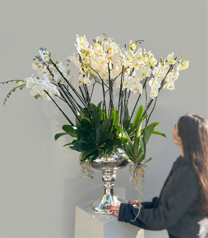 Eskitme görünümlü grand silver renkli cam saksıda; özel 20 Dallı Beyaz Orkideler