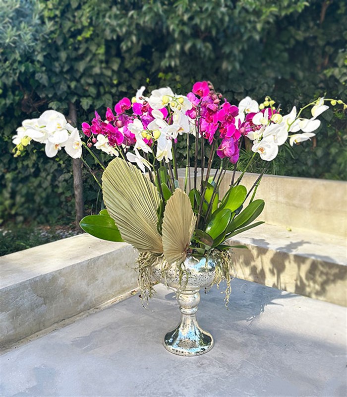 Eskitme görünümlü grand silver renkli cam saksıda; özel 20 Dallı Fuşya Beyaz Orkideler
