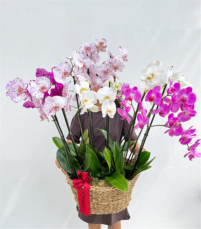 Lüks hasır sepet içerisinde toplam 12 dal fuşya beyaz orkideler ile sevdiklerinize orkide bahçesi armağan edin...