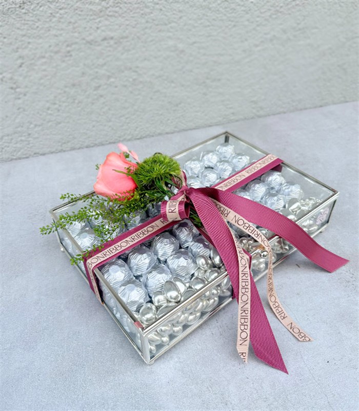 Şık royal deluxe silver detaylı cam kutu içerisinde luxe çikolata, badem draje ve taze çiçeklerle dizayn edildi.