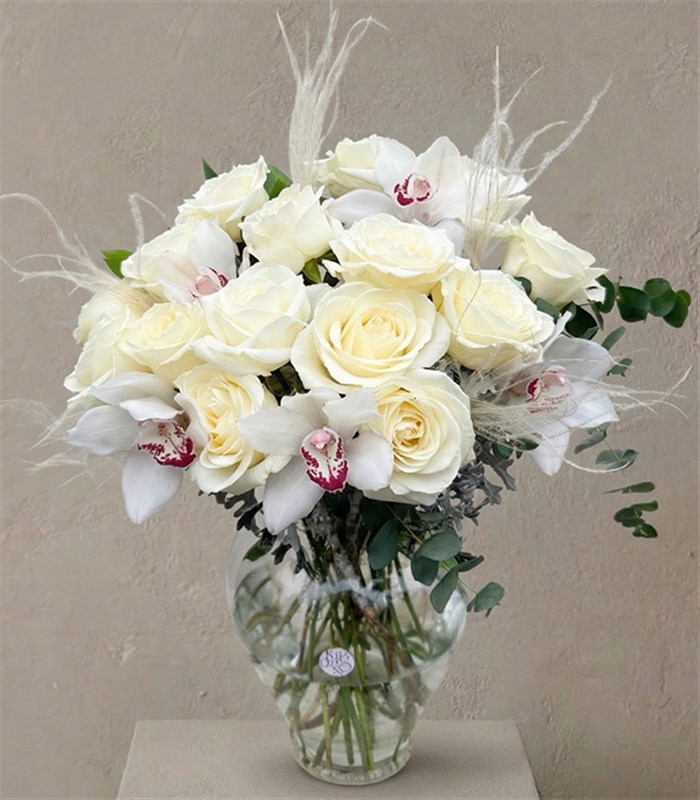 Saf Aşk Cam Vazoda Beyaz Gül Cymbidium Orkide Aranjmanı