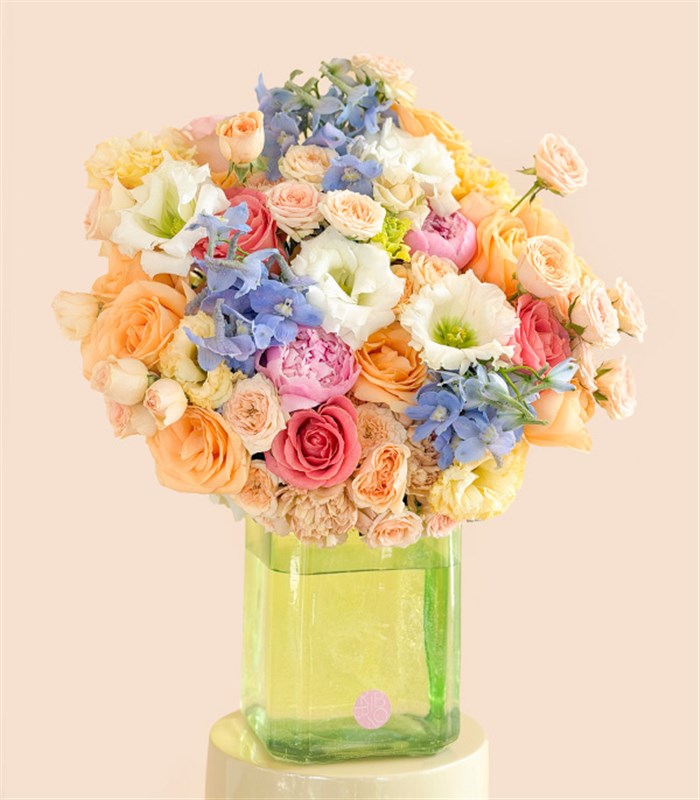 A fresh and vibrant spring arrangement where pink roses, peonies, apricot roses, climbing roses, and delphiniums meet the natural texture of a special green glass vase. Offering the tranquility of green and the warmth of pink, Sage is a unique choice to send to your loved ones.