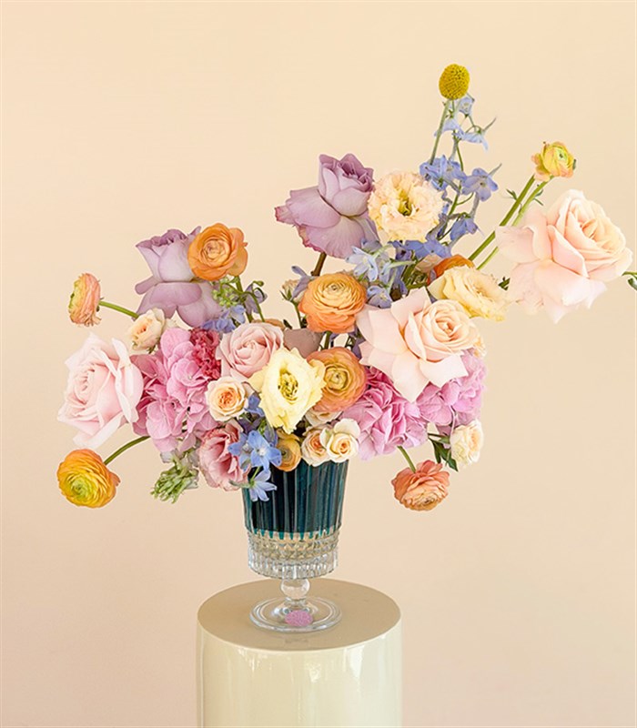 Sapphire, pembe ortanca, pembe gül, lila gül, somon erengüller, delfinyum ve çardak güllerin mavi kristal vazonun büyüleyici dokusuyla buluştuğu baharın en asil aranjmanı. Mavinin serinliği ile pembenin sıcaklığını bir arada sunan Sapphire, sevdiklerinize özel günlerde göndermek için mükemmel bir seçim.
