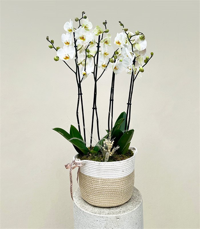 Hasır lüks sepet içerisinde ithal beyaz 4 dal orkide bulunmaktadır.