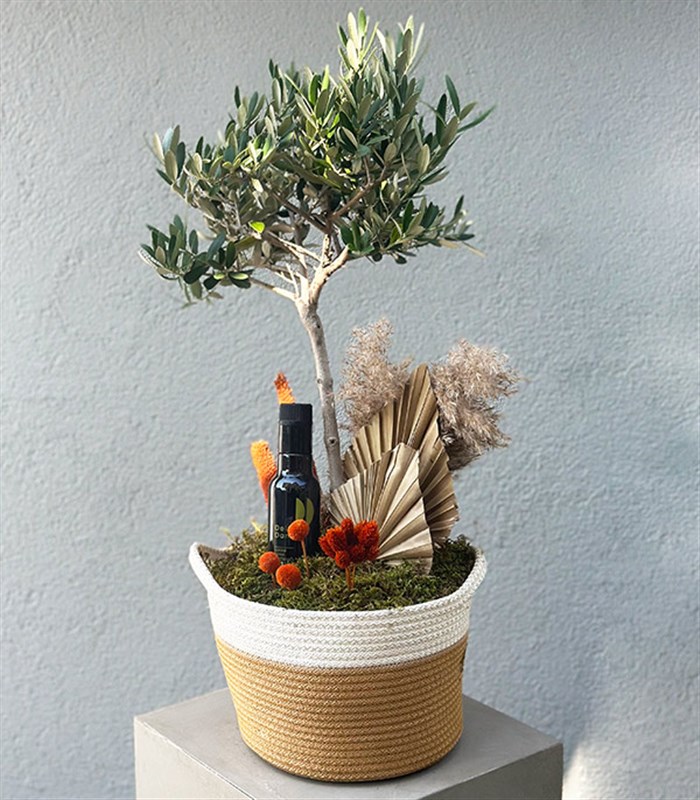 Hasır sepet içerisinde, zeytinyağı ve sonbahar tonlarında kuru çiçeklerle süslenmiş zeytin ağacı...