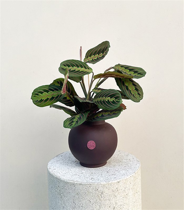 Kahverengi seramik saksı içinde bir adet Maranta bitkisi bulunmaktadır.
