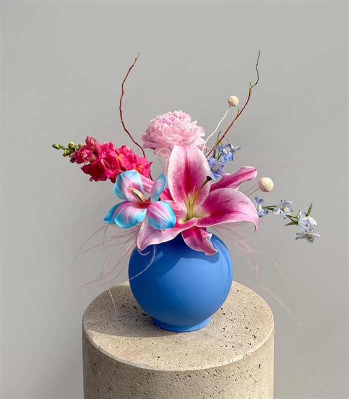 Pembe lilyum, şakayık, mavi delfinyumlar ve pembe aslanağzının mavi seramik vazonun sade dokusuyla buluştuğu minimal ve zarif bir tasarım. 10 Mayıs Anneler Günü'nde annenize göndermek için eşsiz bir seçim.