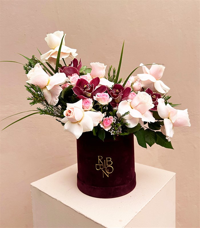 Serenity Bordo Kutu Pembe Güller, pembe ekvator gülleri ve çardak güller eklenerek mevsim çiçekleri ile dizayn edildi.