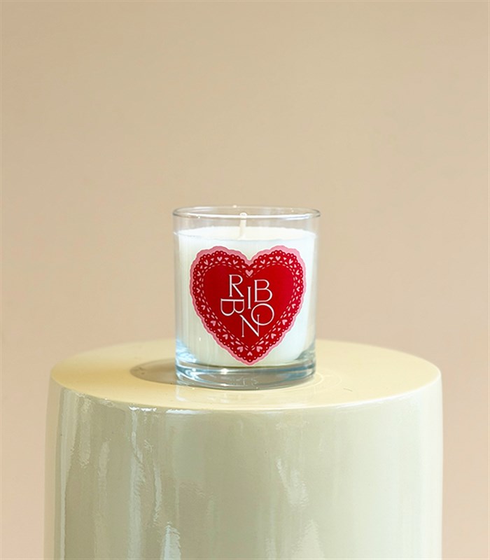Sevgililer Gününe özel, kırmızı kalp sticker ile hazırlanmış kokulu mum.