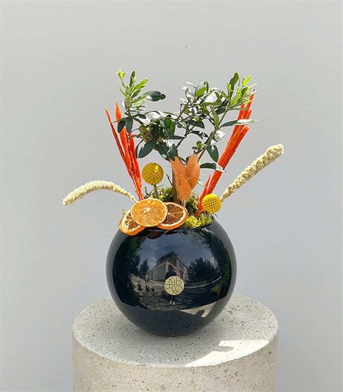 Siyah saksı içerisinde, kuru çiçeklerle süslenmiş zeytin ağacı...