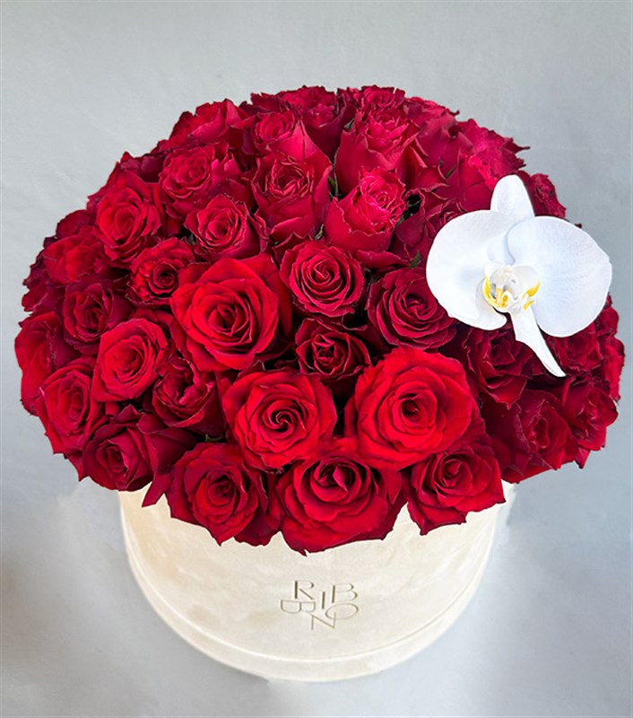 Krem renk grand kadife kutunun içinde yaklaşık 50 adet ekvatordan ithal kırmızı güller ve 1 adet beyaz kandil orkide bulunmaktadır.