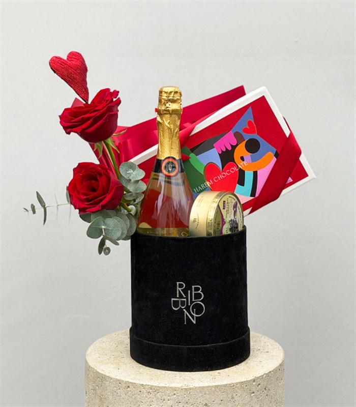 Siyah kadife kutuda alkolsüz şampanya, Harem Chocolate Love Kutu, Cavendish Şekerleme, Kırmızı Güller ve El yapımı Kırmızı Simli kalp figür bulunmaktadır.