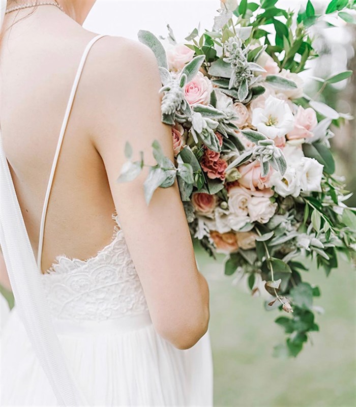 Soft renklerde güller, açık renklerde çardak güller, beyaz lisiantuslar, pelin otu ve mis kokulu okaliptuslar....