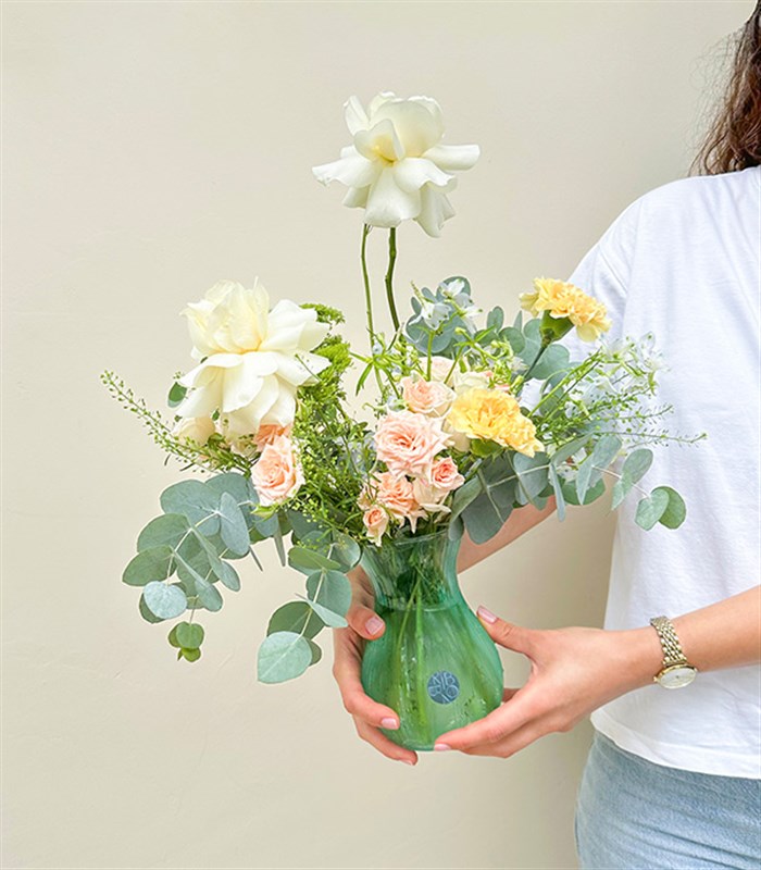 Spring Bud Su Yeşili Vazoda Pastel Yaz Çiçekleri Aranjmanı