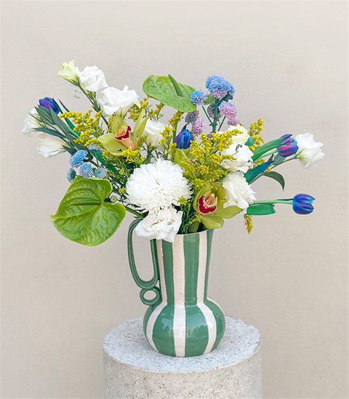 Hande Ceramic Studio kurucusu "Hande Şahinkaya" tarafından sadece RIBBON'a özel dizayn edilen tamamen el yapımı "Yeşil El İşi Seramik Sürahi Vazo" içerisinde hazırladığımız, benzersiz vazosu ile kalıcı hale gelebilen fresh bir bahar aranjmanı...