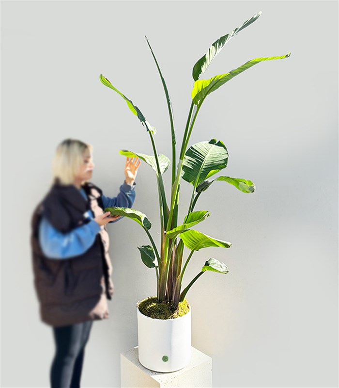 Seramik beyaz renkli büyük boy saksı içerisinde, Strelitzia yani ülkemizde bilinen ismi ile Starliçe Cennet Kuşu Bitkisi ekilmiştir.