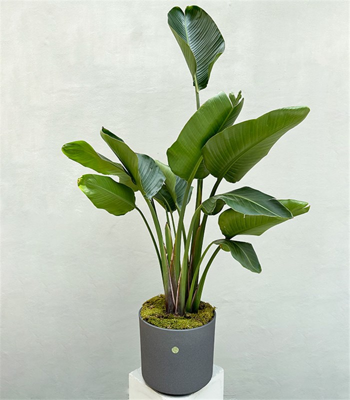 Seramik gri renkli büyük boy saksı içerisinde, Strelitzia yani ülkemizde bilinen ismi ile Starliçe Cennet Kuşu Bitkisi ekilmiştir.