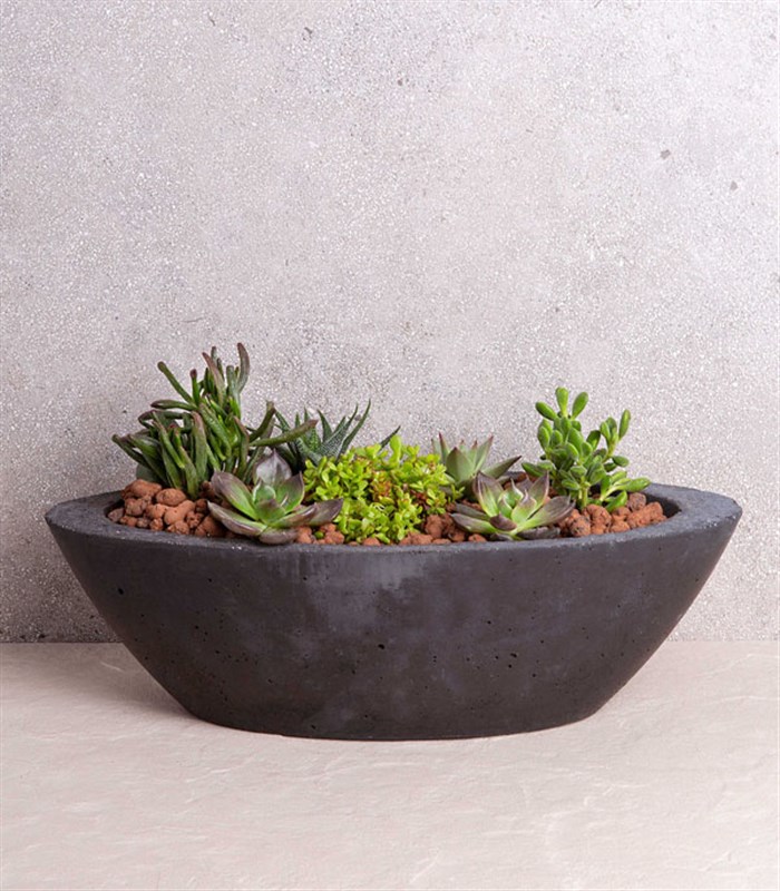 Oval beton saksı içinde 7-8 adet sukulent kullanarak hazırlanmıştır.
