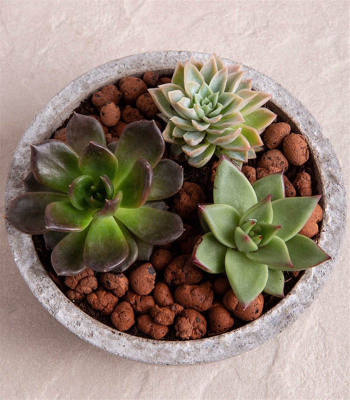 Yuvarlak beton saksı içinde üç adet sukulent kullanarak hazırlanmıştır.