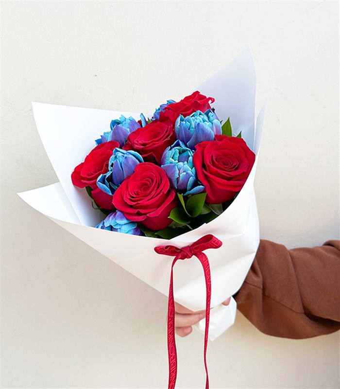 Sky koleksiyonumuzdaki sunset renkli çantamızın içerisine yerleştirdiğimiz 6 galaksi lale 6 kırmızı gül ile hazırlanmış mini buketimiz ve beyaz pelur kağıtları bulunmaktadır.