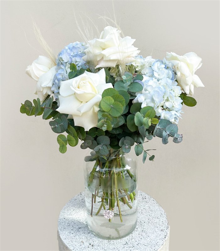Thais Cam Vazoda Mavi Ortanca Beyaz Güller Aranjmanı