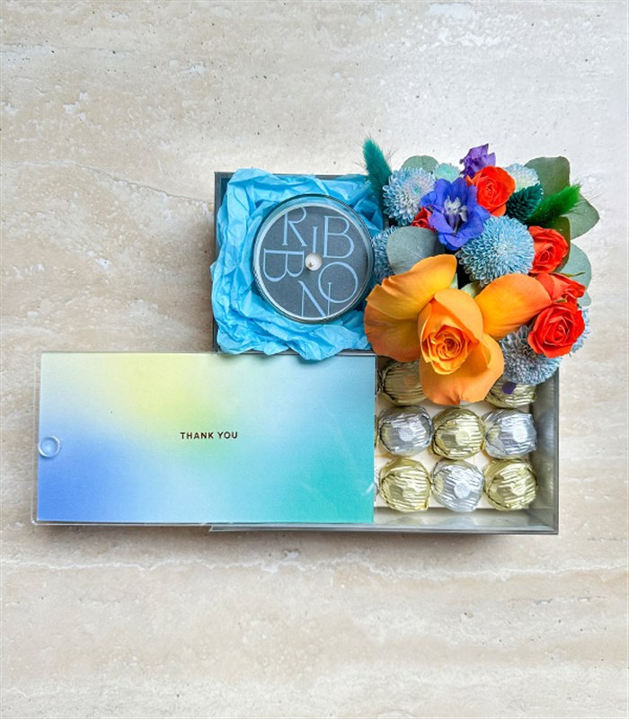 'Thank You' not kartı kaydırınca çıkan çikolata süprizi ve eturuncu mavi çiçekler ile sevdiğinize unutamayacağı bir hediye verin.