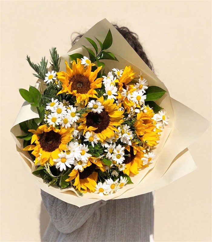 İçerisinde Ayçiçekleri, Papatyalar, sarı toplar ve yeşillikler bulunmaktadır. Sarı pelur ve craft kağıda sarılmıştır.