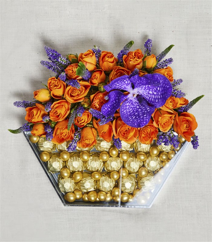 Enfes güzellikte mor ve turuncu çiçeklerin uyumu ile, altın çikolatanın birleştiği altıgen ayna tepsi kutu hediyesi hem göze hem damağa hitap ediyor.