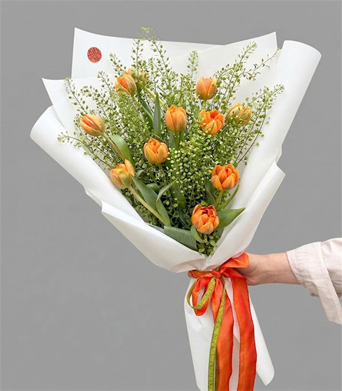 Turuncu Günaydın Buketi; 12 adet turuncu laleler ve traspi yeşillikleri ile dizayn edildi.