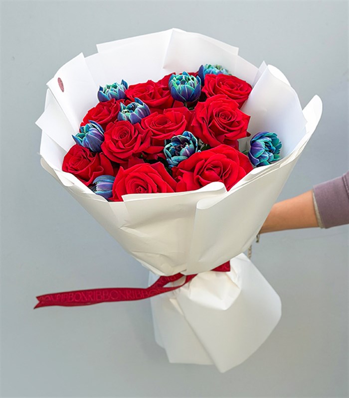 Lüks kağıt ile sarılmış gösterişli ve şık bir bukettir.