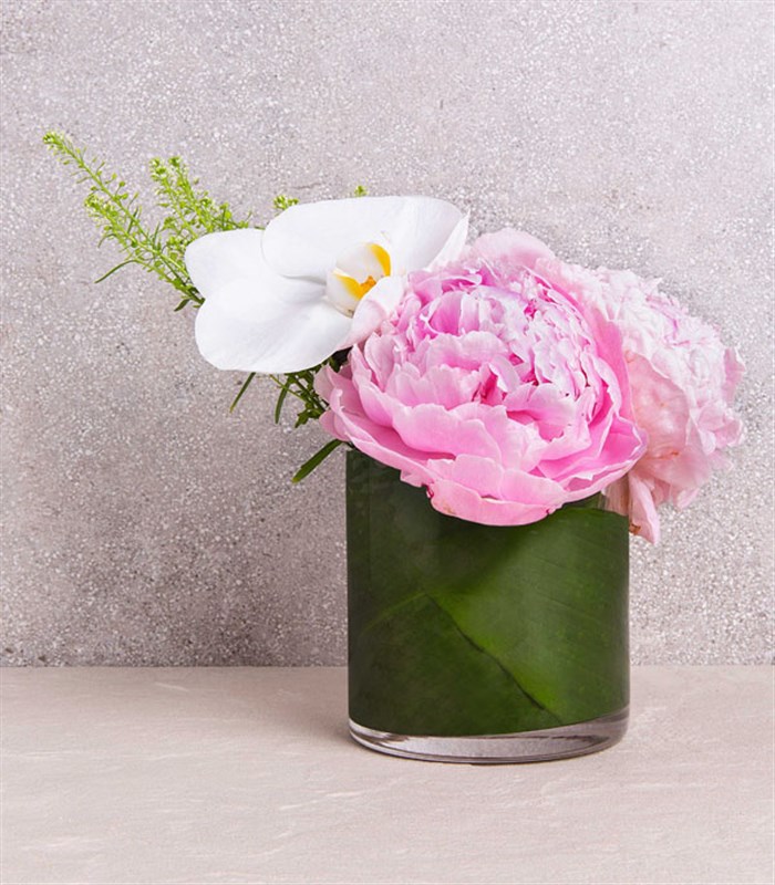 Şakayıklar ile orkide sadelik ve zarafetle vazoda buluşuyor.