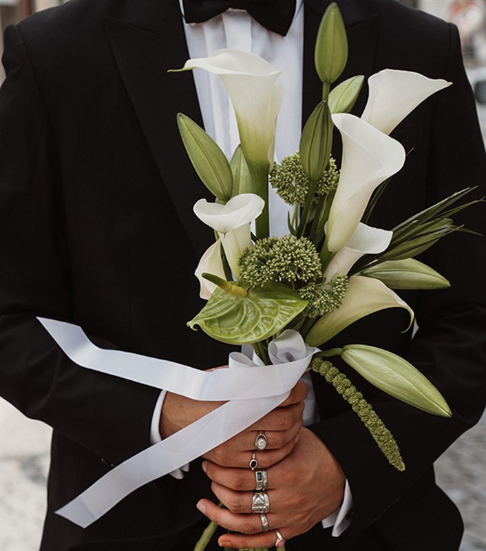 Beyaz gala, yeşil antoryum, lilyum çiçeği ve yeşillikler ile hazırlanmış benzersiz bir gelin buketi..