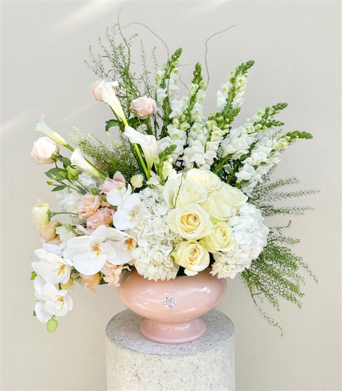 Voyage Pudra Seramik Vazoda Beyaz Gül Ortanca Grand Deluxe Aranjman