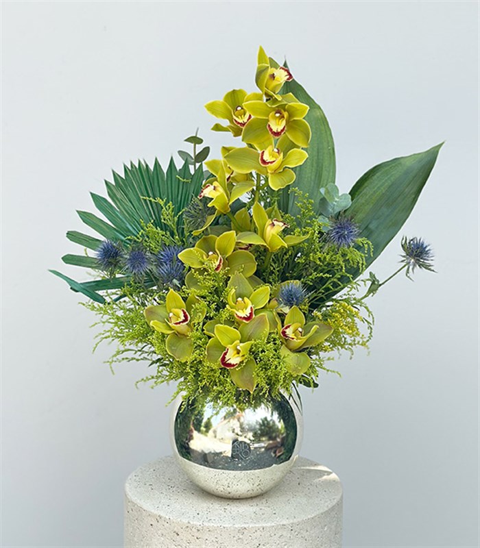 Gümüş vazodaki Top Vazoda Yeşil Cymbidium Orkide yeşillikler ile hazırlanmış naturel bir aranjman.