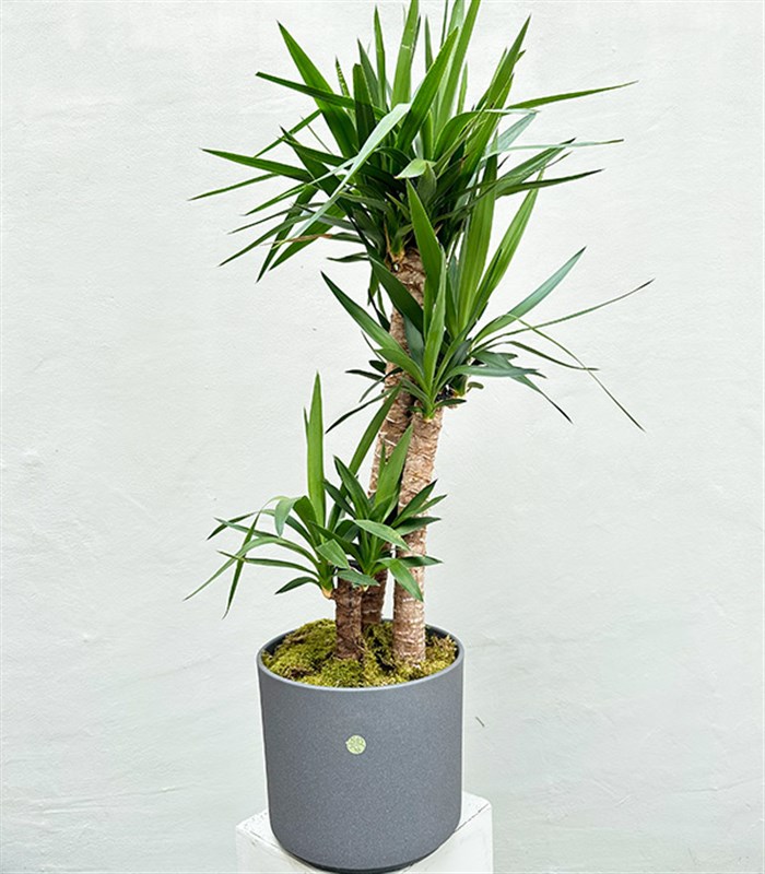 Antrasit deluxe seramik saksı içerisinde, Yucca yani ülkemizde bilinen ismi ile Avize Ağacı 3 Gövdeli Yuka Ağacı ekilmiştir.