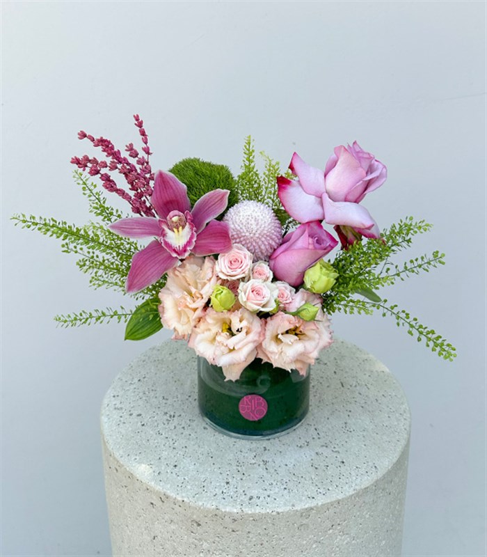 Mini cam vazoda lila güller, pembe top anastasia, somon lisyantuslar, pembe çardak güller, pembe cymbidium orkide, greentrick, traspi yeşillikleri ve kuru çiçekler ile dizayn edildi.